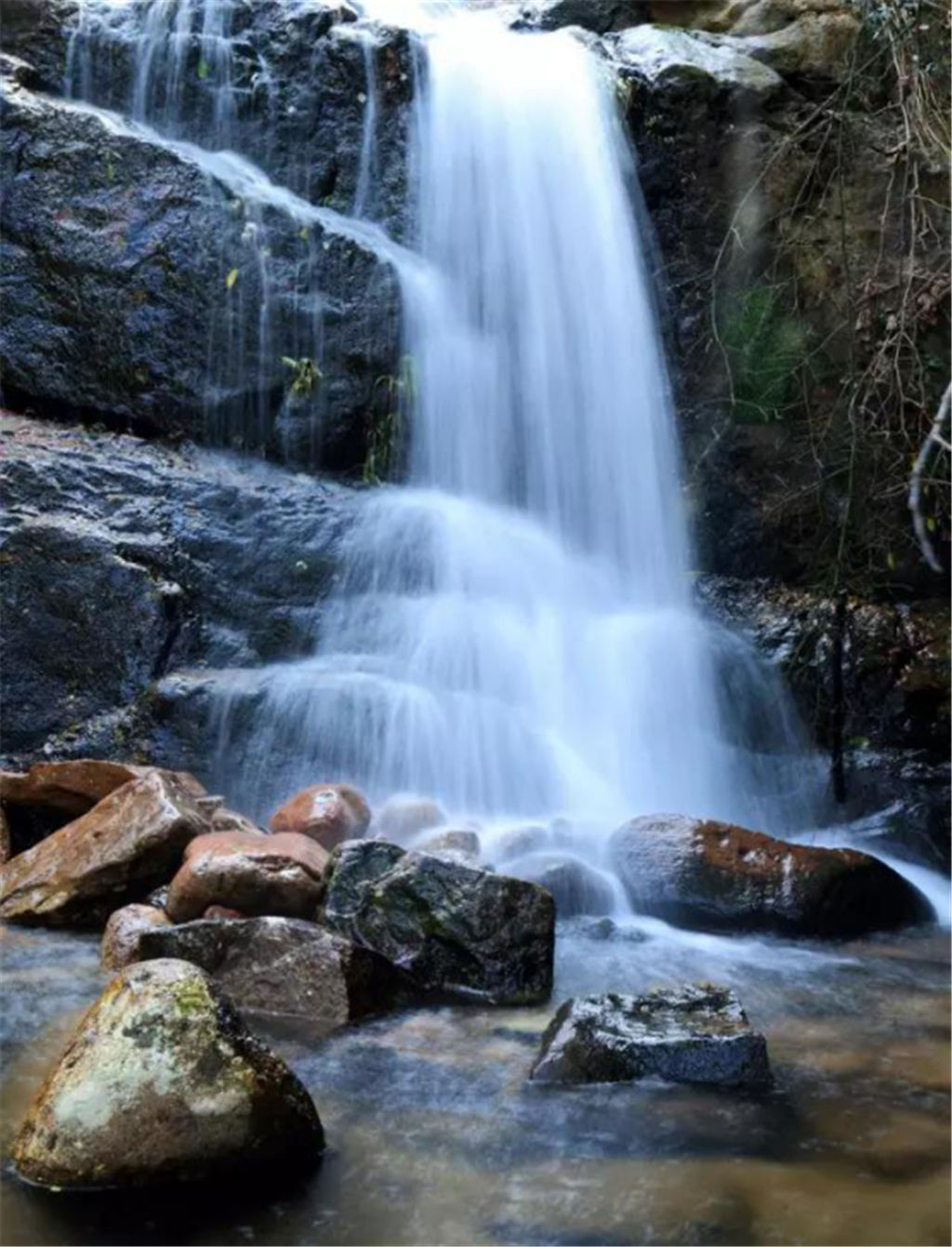 豐水期,遠遠的未見其水,便聞其聲,隆隆的水聲如雷鳴般響徹山谷,清澈的山泉水順著山勢歡快地奔騰而下,水流沖落在瀑布下的巖石上,飛濺起粒粒的水珠,銀白閃亮,就像晶瑩的珍珠正在翻滾跳躍。