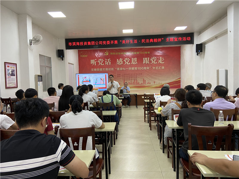 2021年6月28日,集團(tuán)公司黨委組織黨員干部到文昌社區(qū)開(kāi)展“美好生活·民法典相伴”主題宣傳活動(dòng)。并在文昌社區(qū)新時(shí)代文明實(shí)踐大課堂舉辦了一場(chǎng)《中華人民共和國(guó)民法典》宣傳宣講。