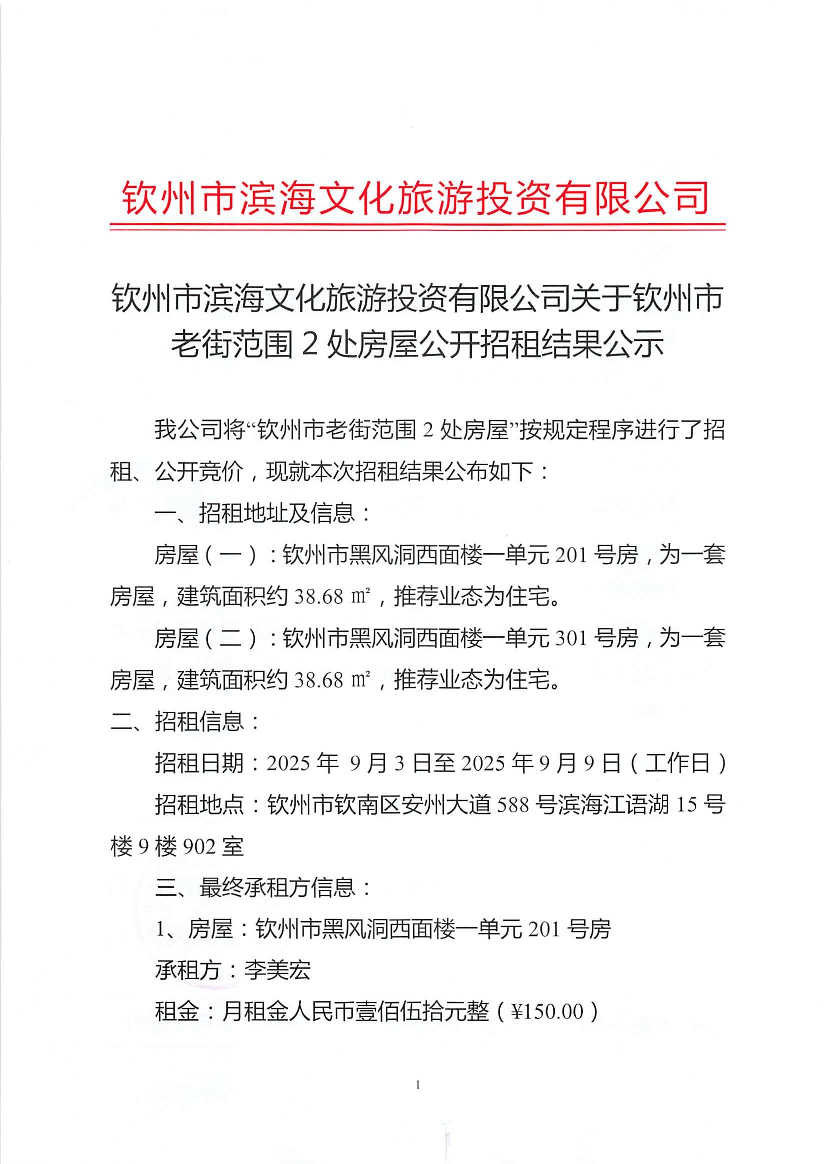 欽州市濱海文化旅游投資有限公司關(guān)于欽州市老街范圍2處房屋公開招租結(jié)果公示