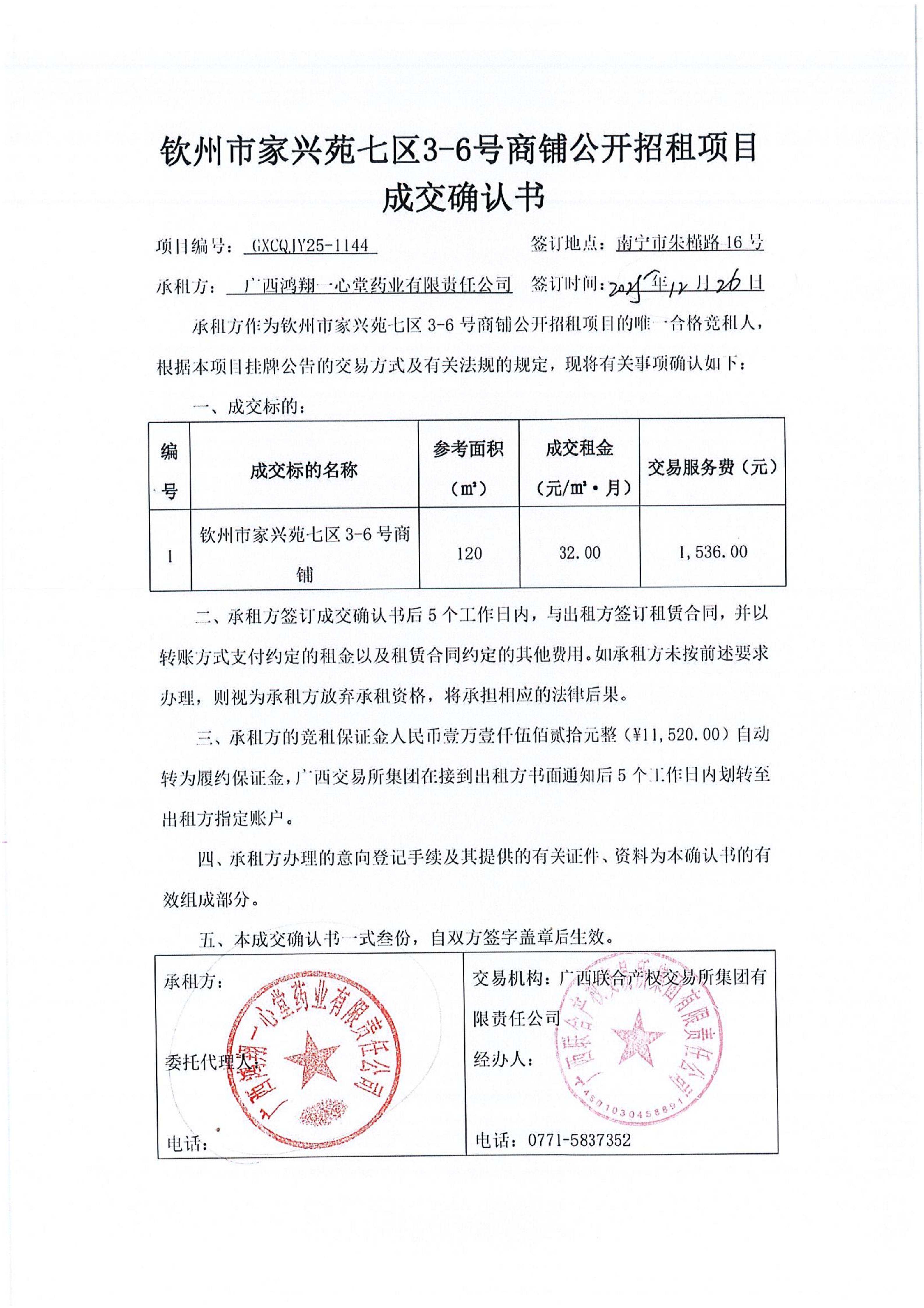 欽州市家興苑七區(qū)3-6號(hào)商鋪公開招租項(xiàng)目 成交確認(rèn)書