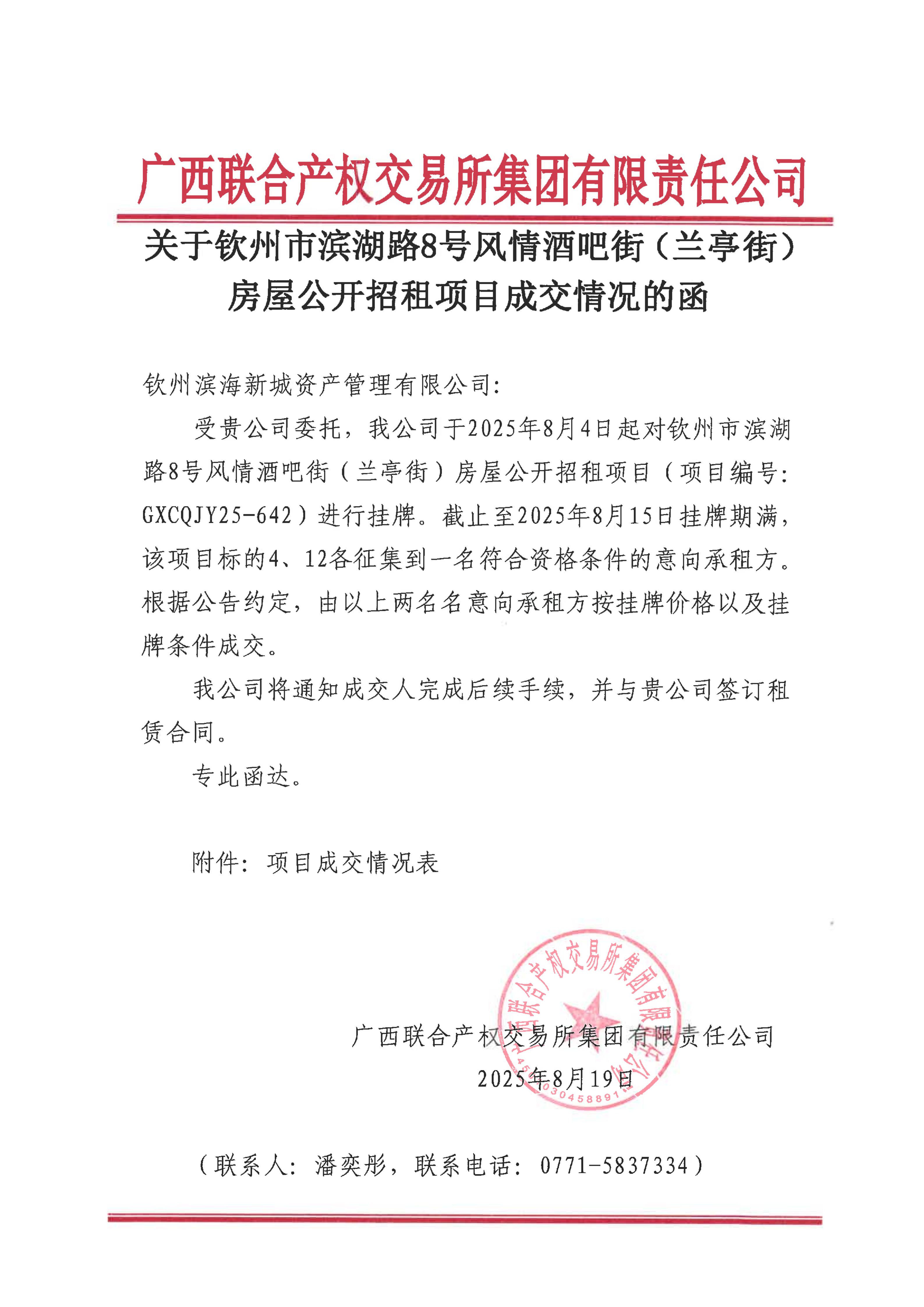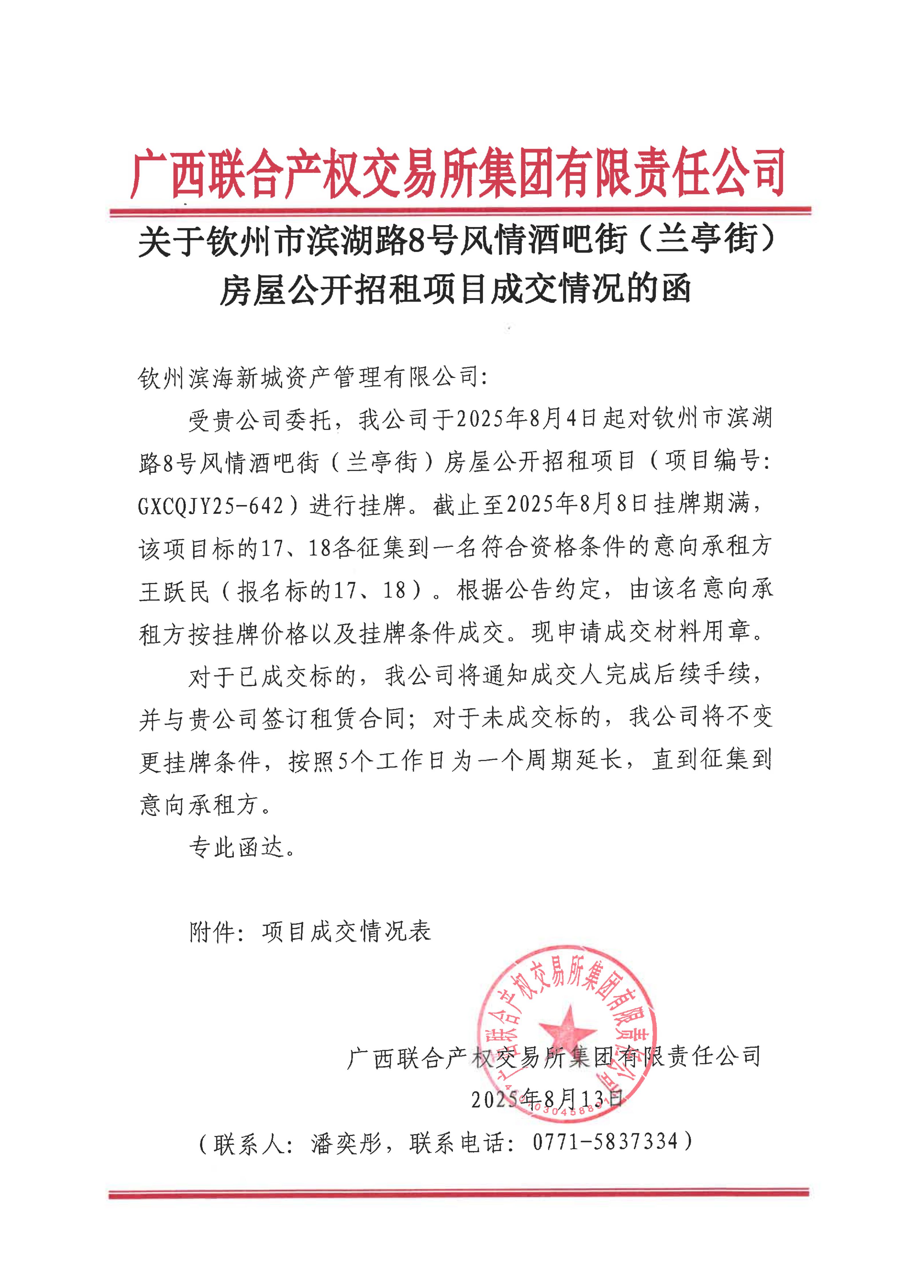 關(guān)于欽州市濱湖路8號(hào)風(fēng)情酒吧街(蘭亭街)房屋公開招租項(xiàng)目成交情況的函(...