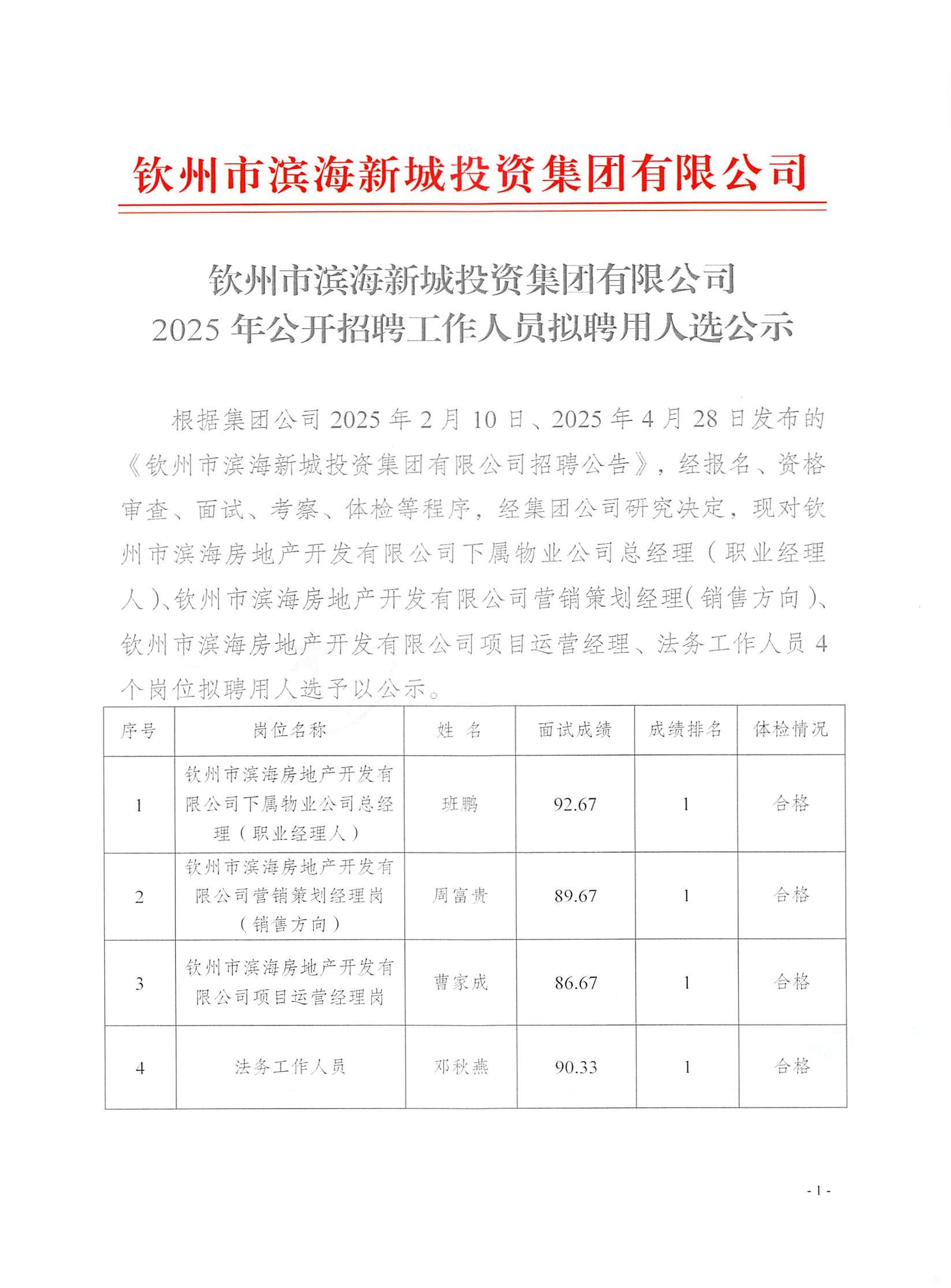 欽州市濱海新城投資集團(tuán)有限公司2025年公開招聘工作人員擬聘用人選公示