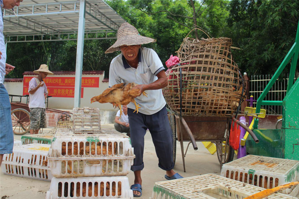(圖為貧困戶將雞苗分裝到自備的雞籠里)