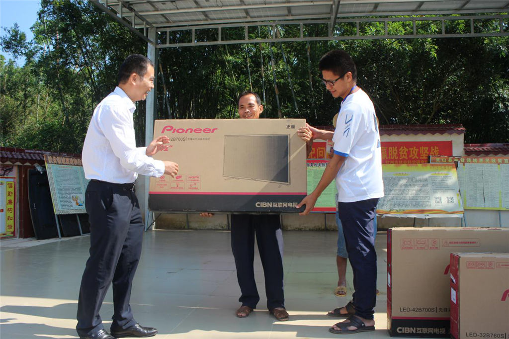 圖為集團公司總經(jīng)理覃世金為貧困戶發(fā)放電視機