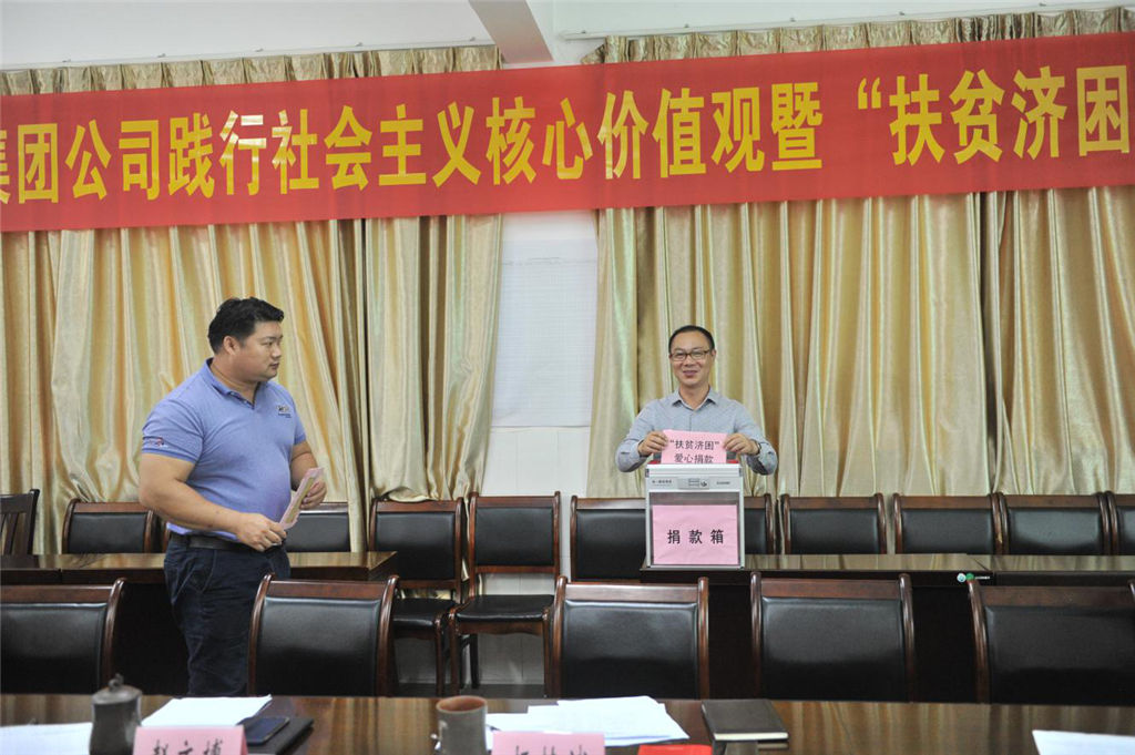 圖為集團(tuán)公司組織召開(kāi)扶貧政策知識(shí)學(xué)習(xí)專(zhuān)題會(huì) 2018年10月17日是我國(guó)第5個(gè)扶貧日,也是第26個(gè)國(guó)際消除貧困日。為積極響應(yīng)扶貧號(hào)召,集團(tuán)公司圍繞欽州市2018年扶貧日活動(dòng)主題及活動(dòng)方案,開(kāi)展了集團(tuán)公司社會(huì)主義核心價(jià)值觀暨“扶貧濟(jì)困”系列活動(dòng)。 10月19日上午,集團(tuán)公司組織幫扶干部和各部室負(fù)責(zé)人召開(kāi)了扶貧政策知識(shí)學(xué)習(xí)專(zhuān)題會(huì),會(huì)上共同學(xué)習(xí)了《自治區(qū)扶貧開(kāi)發(fā)領(lǐng)導(dǎo)小組關(guān)于調(diào)整我區(qū)扶貧對(duì)象脫貧摘帽標(biāo)準(zhǔn)的通知》(桂扶領(lǐng)發(fā)〔2018〕13號(hào))、《2018年廣西雨露計(jì)劃扶貧培訓(xùn)政策宣傳單》、《關(guān)于轉(zhuǎn)發(fā)〈靈山縣貧困戶(hù)以獎(jiǎng)代補(bǔ)特色產(chǎn)業(yè)扶貧實(shí)施辦法〉的通知》(靈開(kāi)辦發(fā)〔2018〕9號(hào))等文件,讓每個(gè)幫扶干部熟練掌握相關(guān)扶貧政策,促進(jìn)幫扶干部政策理解和知識(shí)吸收,增強(qiáng)運(yùn)用政策和轉(zhuǎn)化政策的能力,最大限度推動(dòng)扶貧政策落地見(jiàn)效。 會(huì)后,立即開(kāi)展了“扶貧濟(jì)困,扶弱助貧”捐贈(zèng)活動(dòng),集團(tuán)公司發(fā)動(dòng)黨員、干部、職工自愿參與扶貧捐贈(zèng)活動(dòng),呼吁全體職工參與到“全國(guó)扶貧日”這項(xiàng)意義深遠(yuǎn)的活動(dòng)中來(lái)?;顒?dòng)中,集團(tuán)公司主要領(lǐng)導(dǎo)帶頭捐款,干部職工都積極響應(yīng),當(dāng)天籌集到的愛(ài)心捐款共計(jì)¥8040.00元(人民幣捌仟零肆拾元整),所籌集的捐款將用于公司定點(diǎn)幫扶貧困村、貧困戶(hù)的生產(chǎn)生活條件改善、產(chǎn)業(yè)發(fā)展或發(fā)展村集體經(jīng)濟(jì)。 圖為集團(tuán)公司董事長(zhǎng)趙文博帶頭捐款 圖為集團(tuán)公司黨員干部積極響應(yīng)捐款號(hào)召