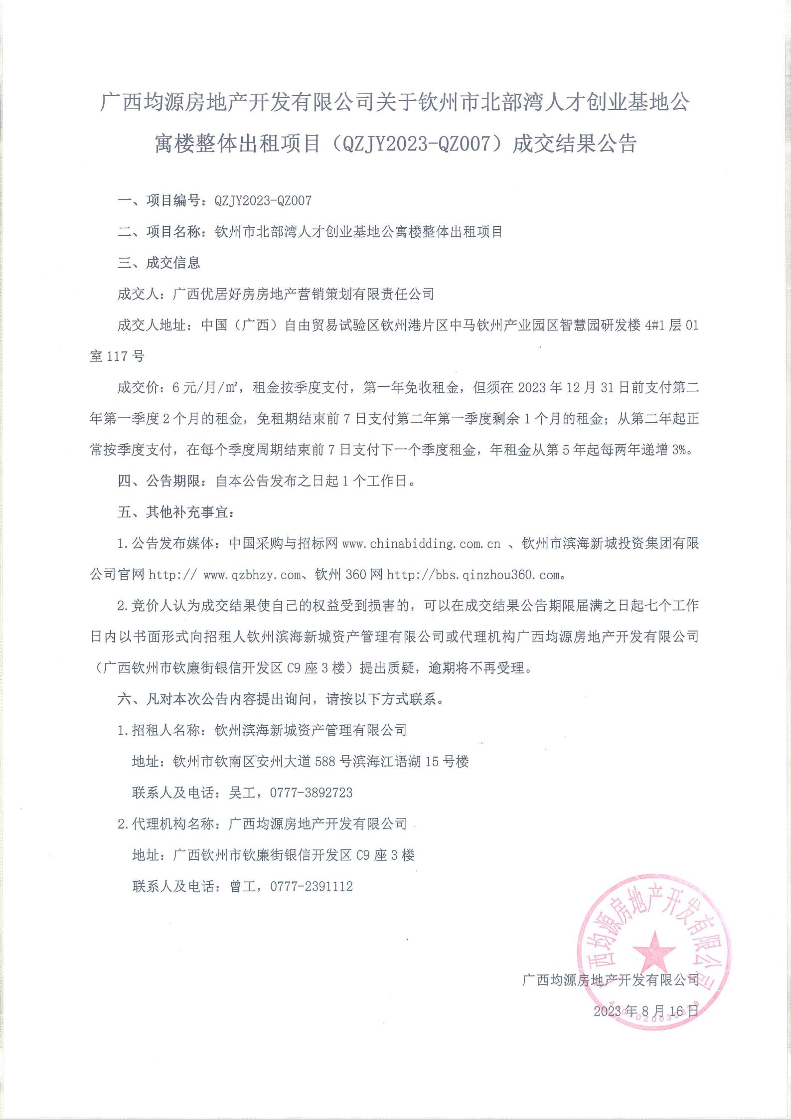 關(guān)于欽州市北部灣人才創(chuàng)業(yè)基地公寓樓整體出租項目成交結(jié)果公告