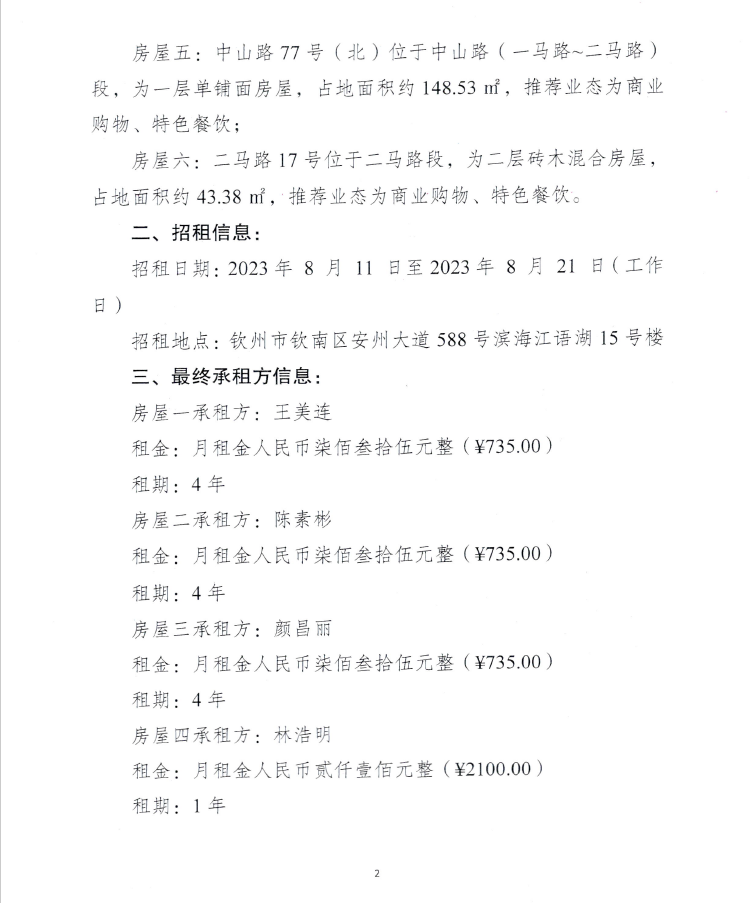 欽州市老街范圍占鰲巷67、71號兩處房屋公開招租結(jié)果公示