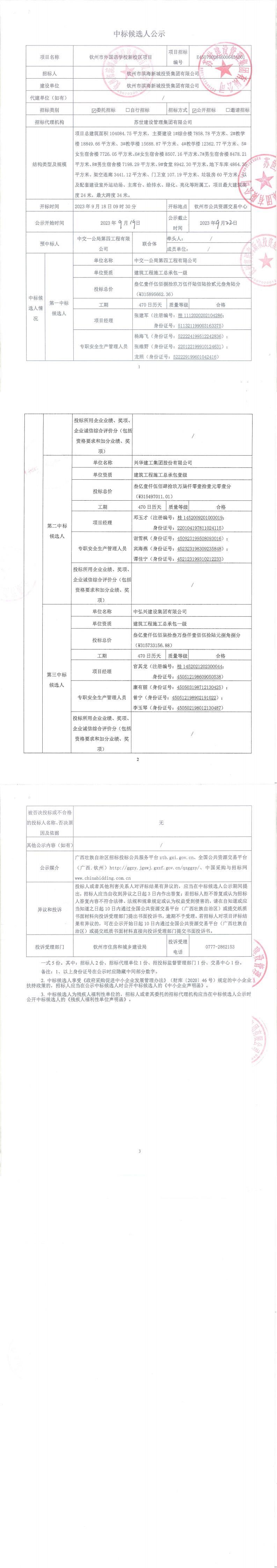 欽州市外國語學(xué)校新校區(qū)項目施工中標(biāo)候選人公示