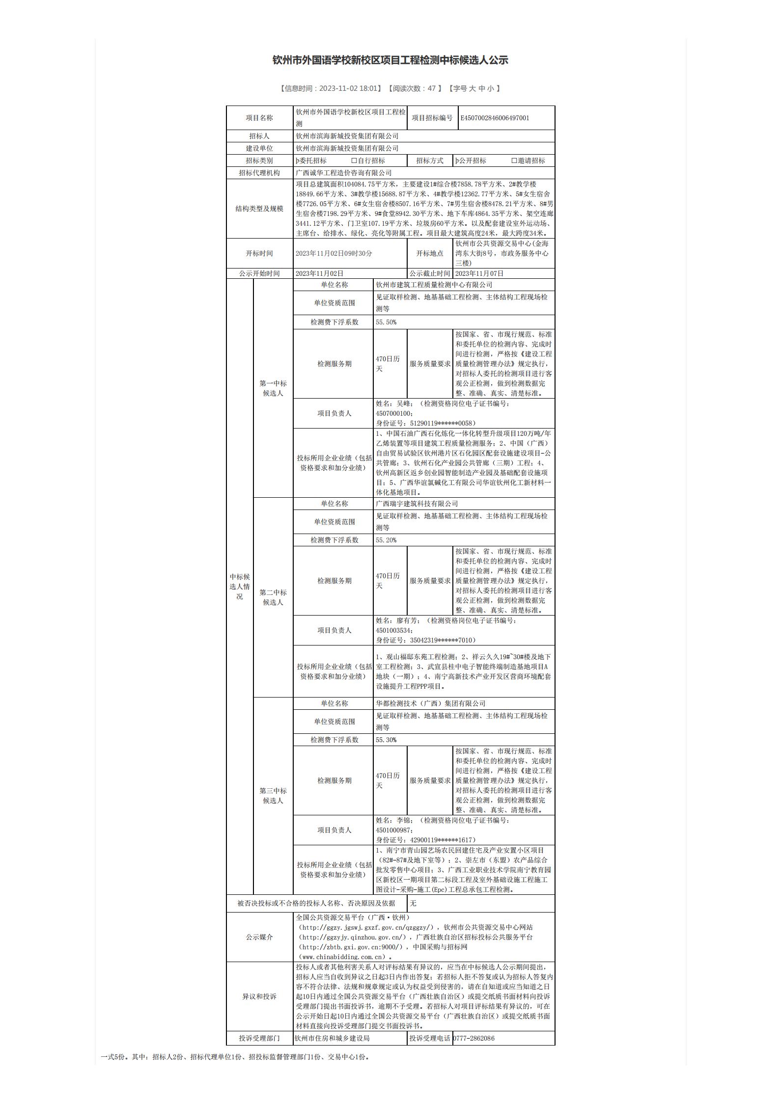 欽州市外國語學(xué)校新校區(qū)項目工程檢測中標(biāo)候選人公示