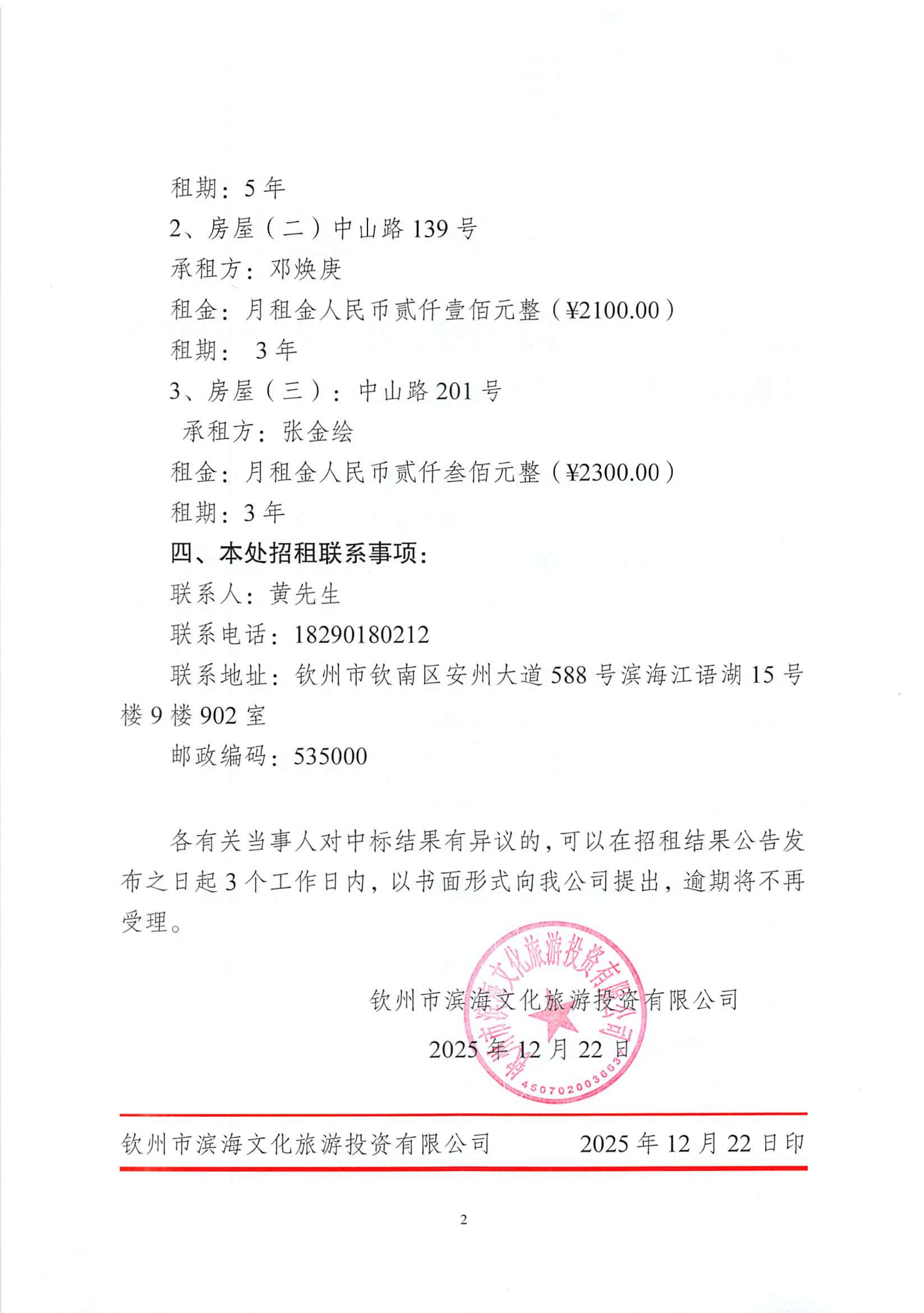 欽州市濱海文化旅游投資有限公司關(guān)于欽州市老街范圍3處房屋(場(chǎng)地)公開(kāi)招租結(jié)果公示(沙尾街20號(hào)、中山路139號(hào)、中山路201號(hào))