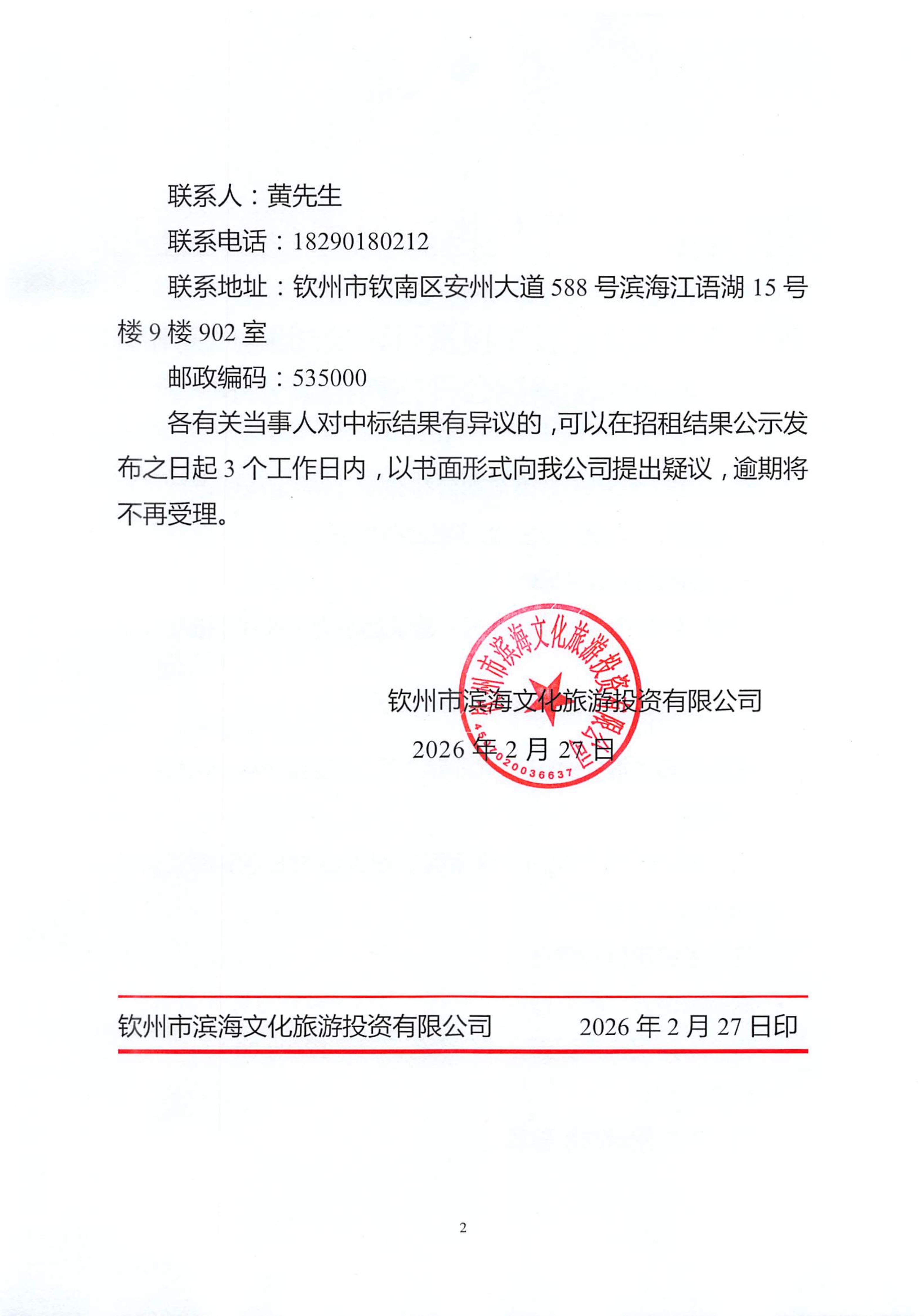 欽州市濱海文化旅游投資有限公司關于欽州市老街范圍3處房屋公開招租結果公示