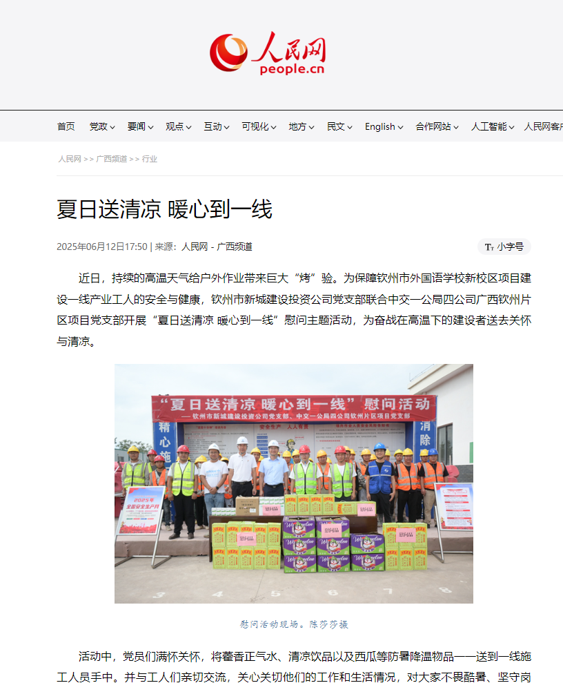 6月12日,人民網(wǎng)-廣西頻道以《夏日送清涼 暖心到一線》為題報道市濱投集團公司黨委下屬建投公司黨支部聯(lián)合中交一公局四公司廣西欽州片區(qū)項目黨支部開展“夏日送清涼 暖心到一線”慰問主題活動,為奮戰(zhàn)在高溫下的建設者送去關懷與清涼,全文如下。