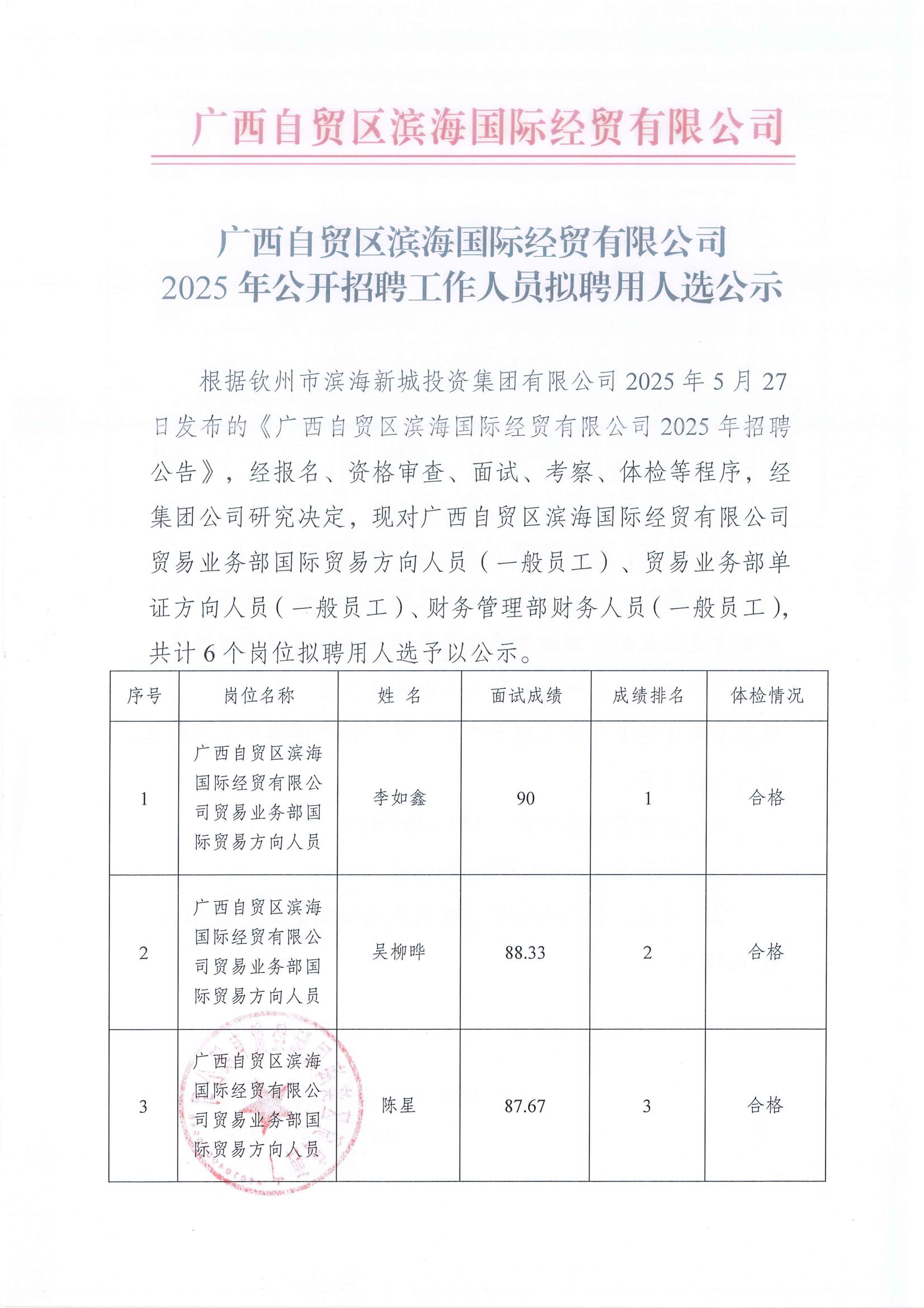廣西自貿(mào)區(qū)濱海國際經(jīng)貿(mào)有限公司2025年公開招聘工作人員擬聘用人選公示
