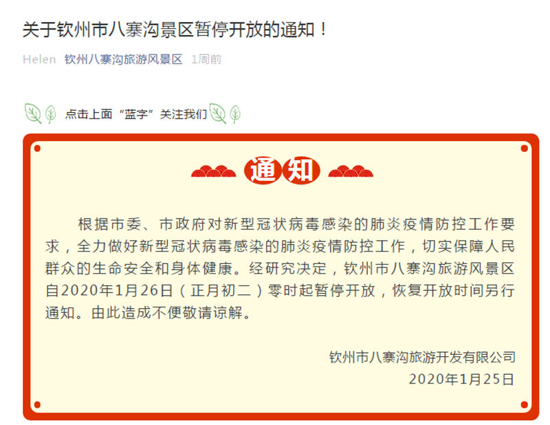 為進(jìn)一步加強(qiáng)八寨溝景區(qū)新型冠狀病毒感染的肺炎疫情防控工作,有效防止疫情經(jīng)旅游途徑傳播,切實(shí)保障游客及公司員工身體健康和生命安全。根據(jù)欽州市委專題擴(kuò)大會(huì)議對(duì)新型冠狀病毒感染肺炎疫情防控工作的部署,欽州市文化廣電體育和旅游局《關(guān)于取消欽州市 2020 年春節(jié)期間文化體育旅游活動(dòng)和暫停相關(guān)文化體育旅游業(yè)務(wù)的通知》,以及欽州市文化廣電體育和旅游局《關(guān)于全市A級(jí)景區(qū)、鄉(xiāng)村旅游區(qū)、農(nóng)家樂暫停對(duì)外開放的通知》,...