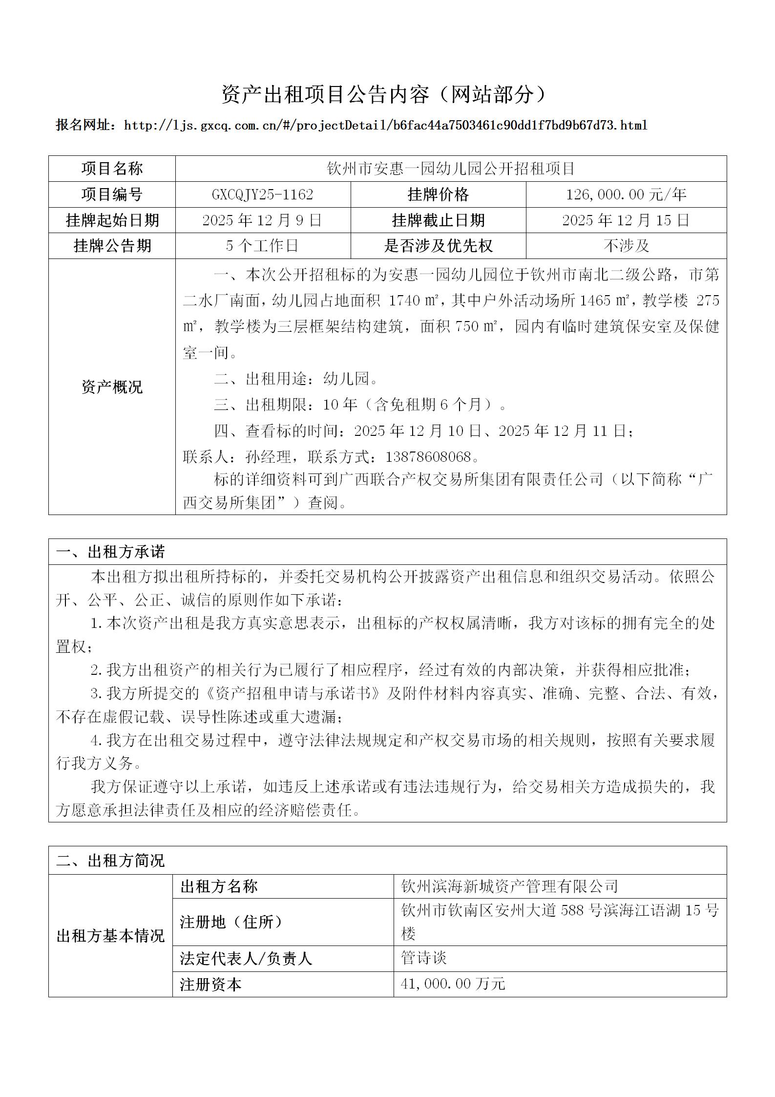 欽州市安惠一園幼兒園資產(chǎn)出租項目公告內(nèi)容(公共資源)