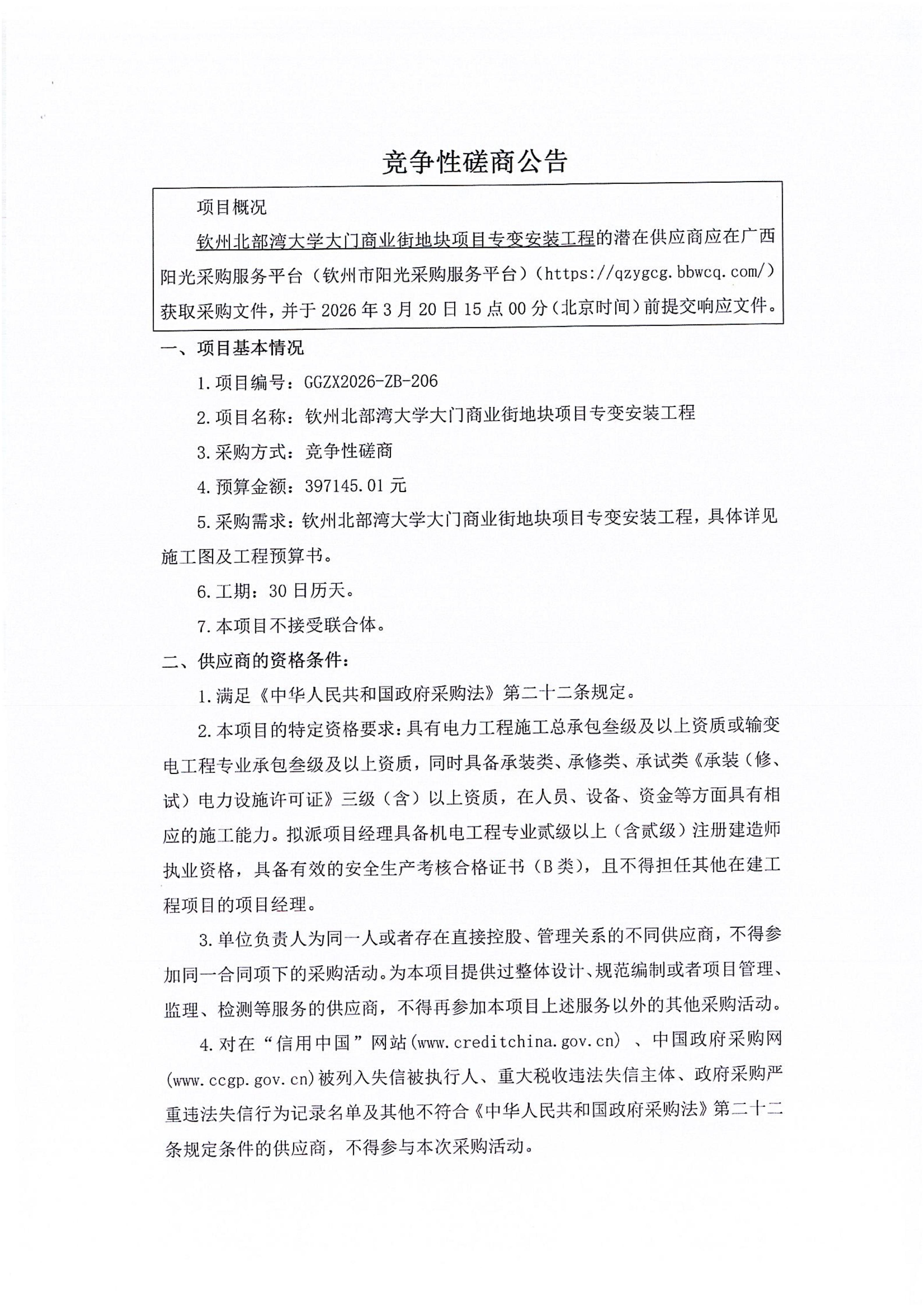 競爭性磋商公告(欽州北部灣大學(xué)大門商業(yè)街地塊項目專變安裝工程)