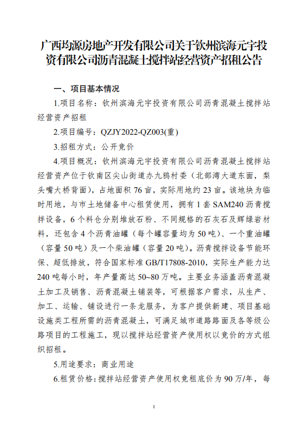 廣西均源房地產(chǎn)開(kāi)發(fā)有限公司關(guān)于欽州濱海元宇投資有限公司瀝青混凝土攪拌站經(jīng)營(yíng)資產(chǎn)招租公告