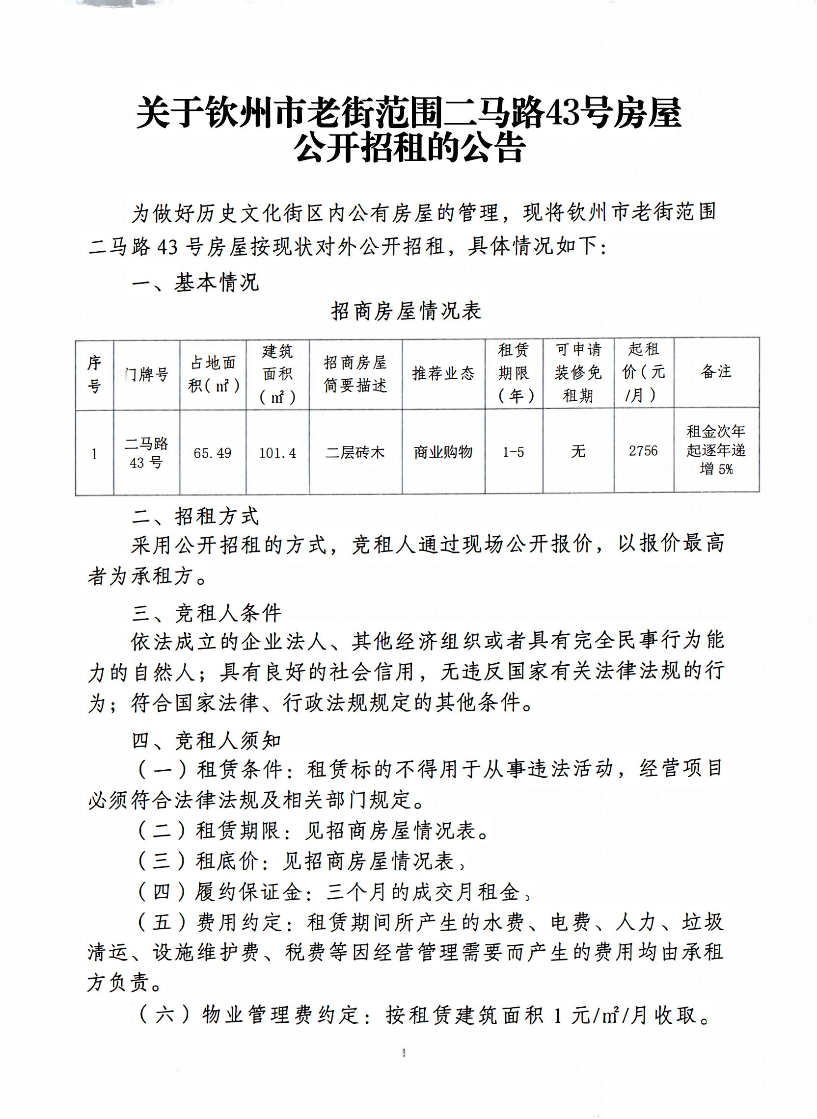 欽州市老街范圍二馬路43號房屋公開招租